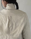ウールリネンの柔らかな素材と、衿ぐり、ウエスト部分、少し開いたベルカフス、肩当てはコットンリネンを使用。布の重なりが生む静かな表情は、毎日の装いに自然な変化をもたらします。