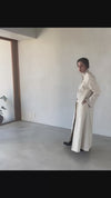 短いベストのような前の合わせと、静かに流れるロング丈へと繋がった構造。